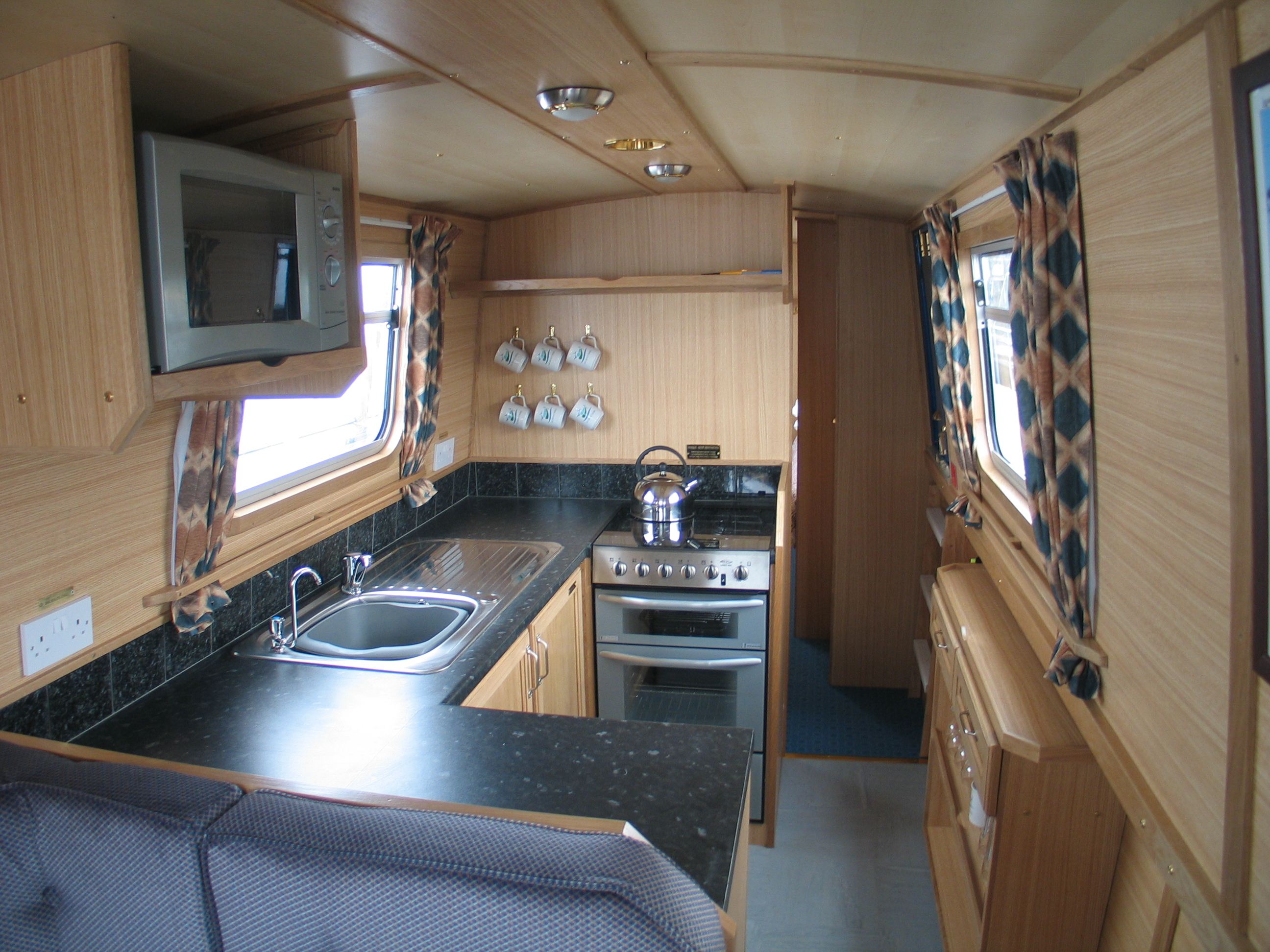 Kitchen : The kitchen is fully equipped and has a 4 burner gas cooker with grill and oven, microwave, refrigerator; sink and drainer; saucepans; cooking utensils; crockery and cutlery appropriate for the number of berths. There is plenty of storage space and work surfaces.