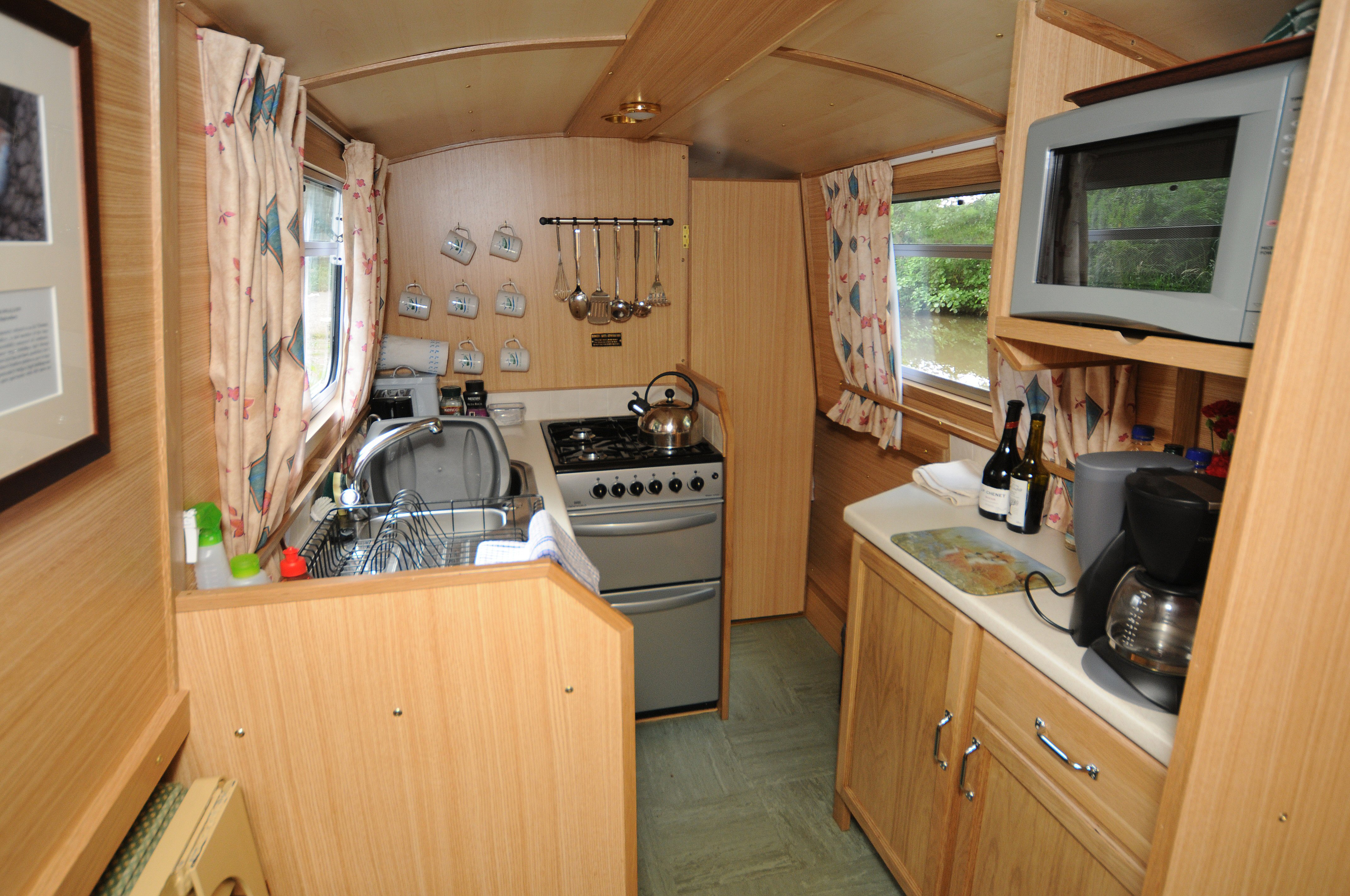 Kitchen : The kitchen is fully equipped and has a 4 burner gas cooker with grill and oven; refrigerator; sink and drainer; saucepans; cooking utensils; crockery and cutlery appropriate for the number of berths. There is plenty of storage space and work surfaces. Also supplied are a microwave; toaster and Cafetiere